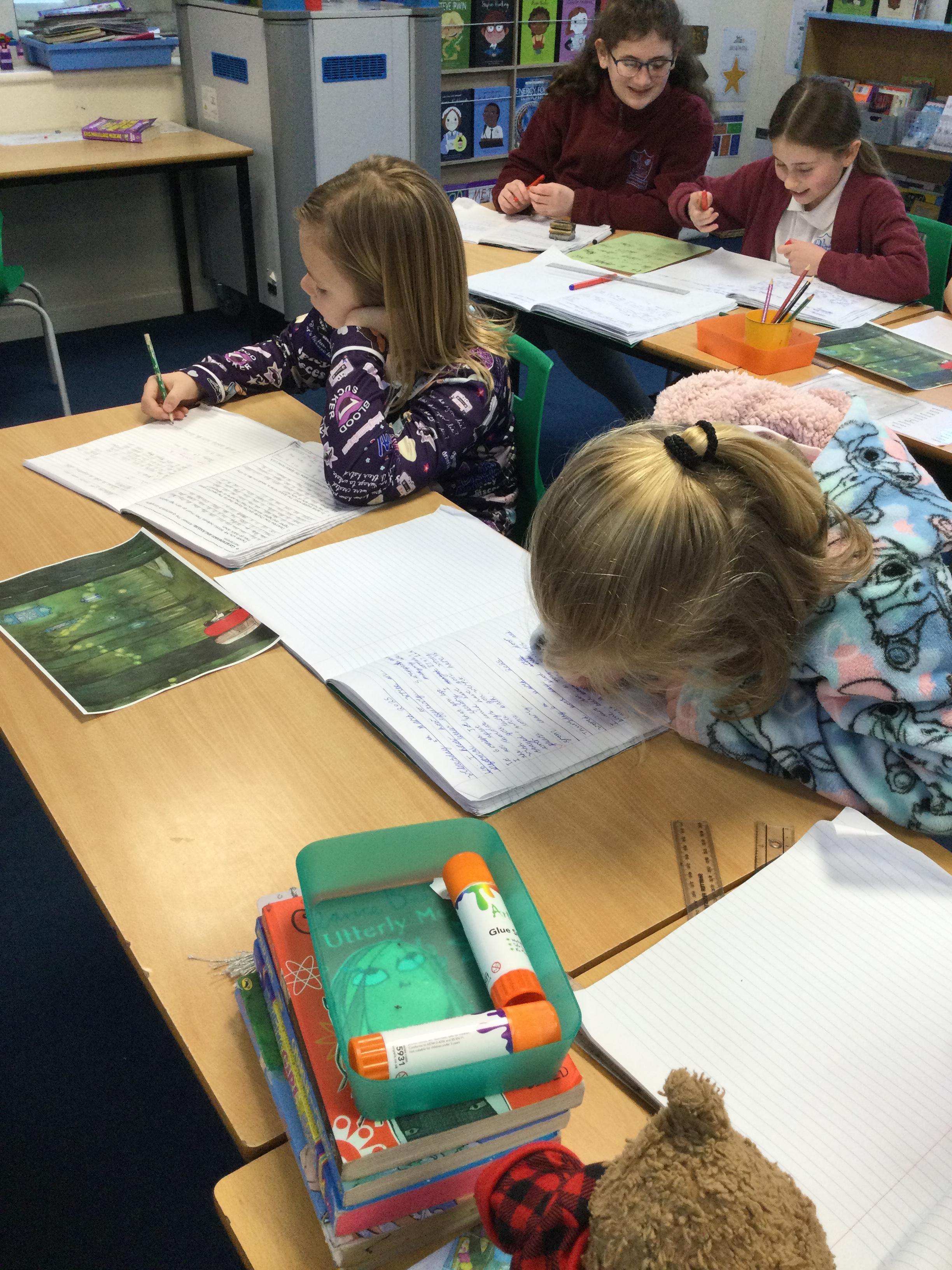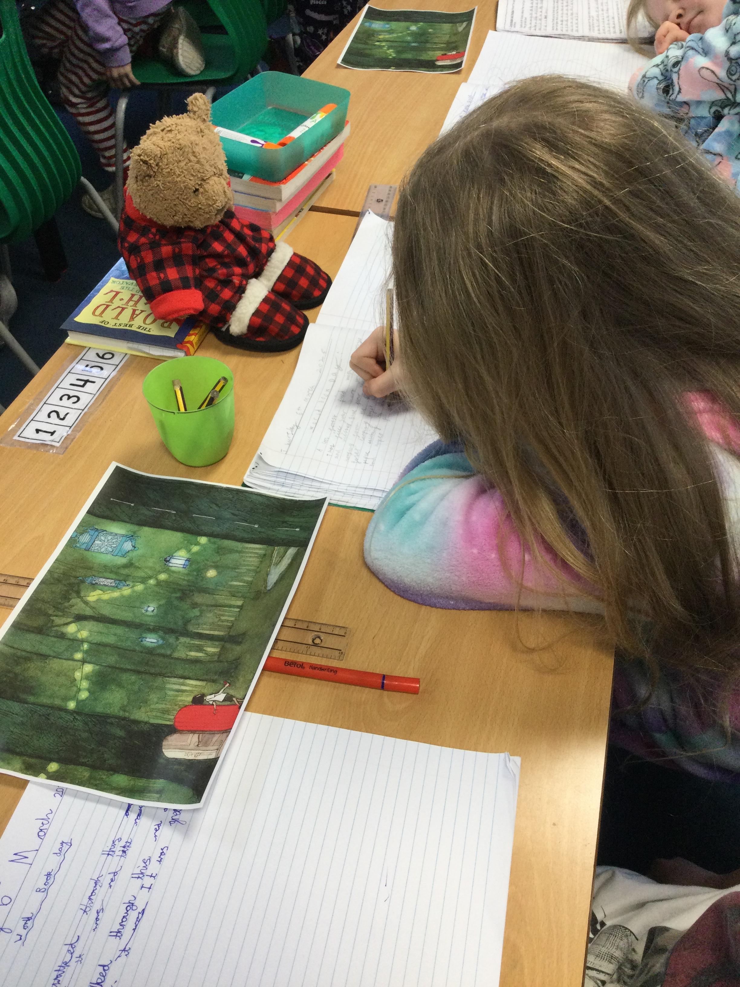 The pupils enjoyed coming to school in their pyjamas! We looked at the beautiful picture book 'Journey' by Aaron Becker and created writing based on an illustration in the story.