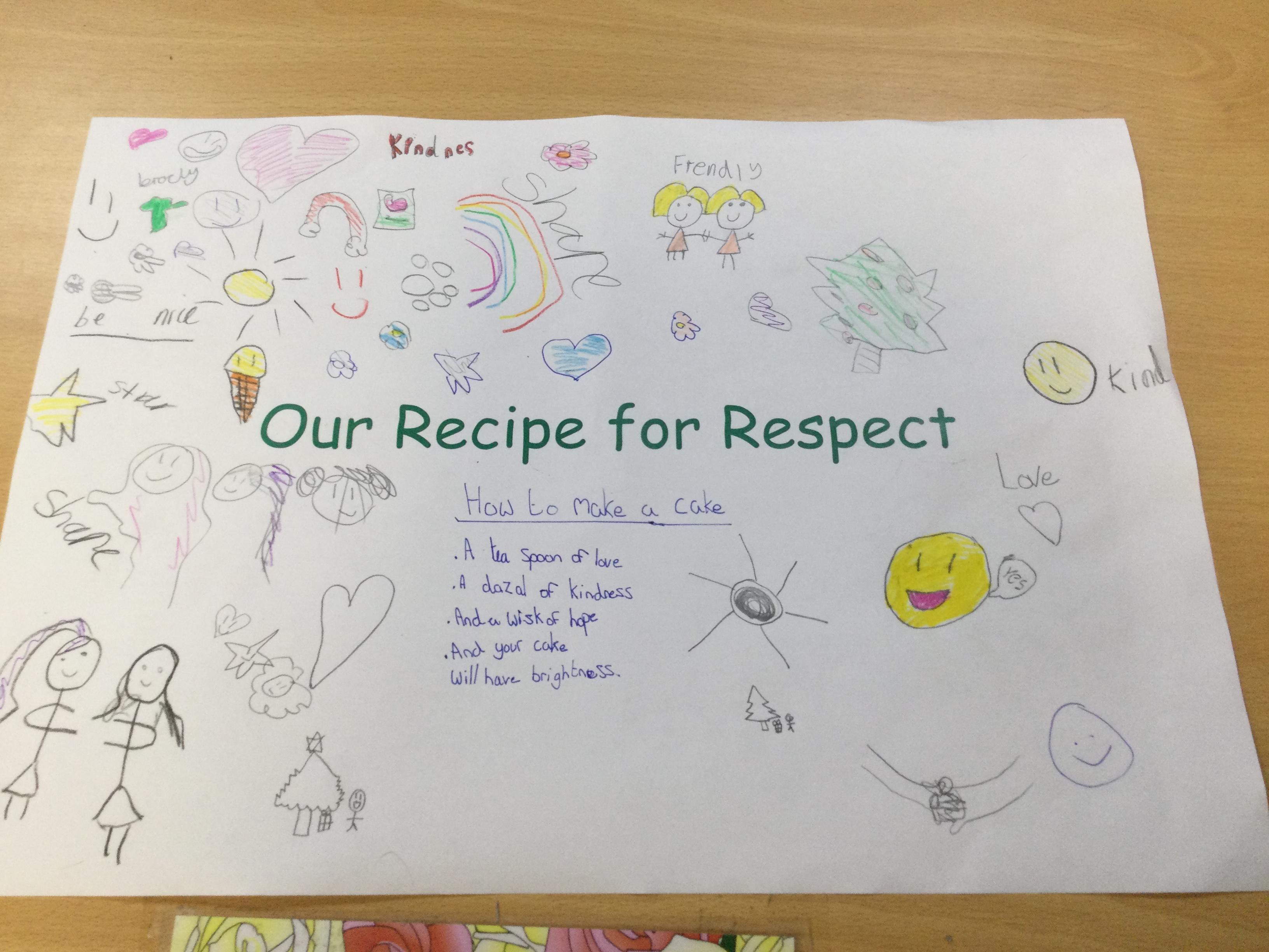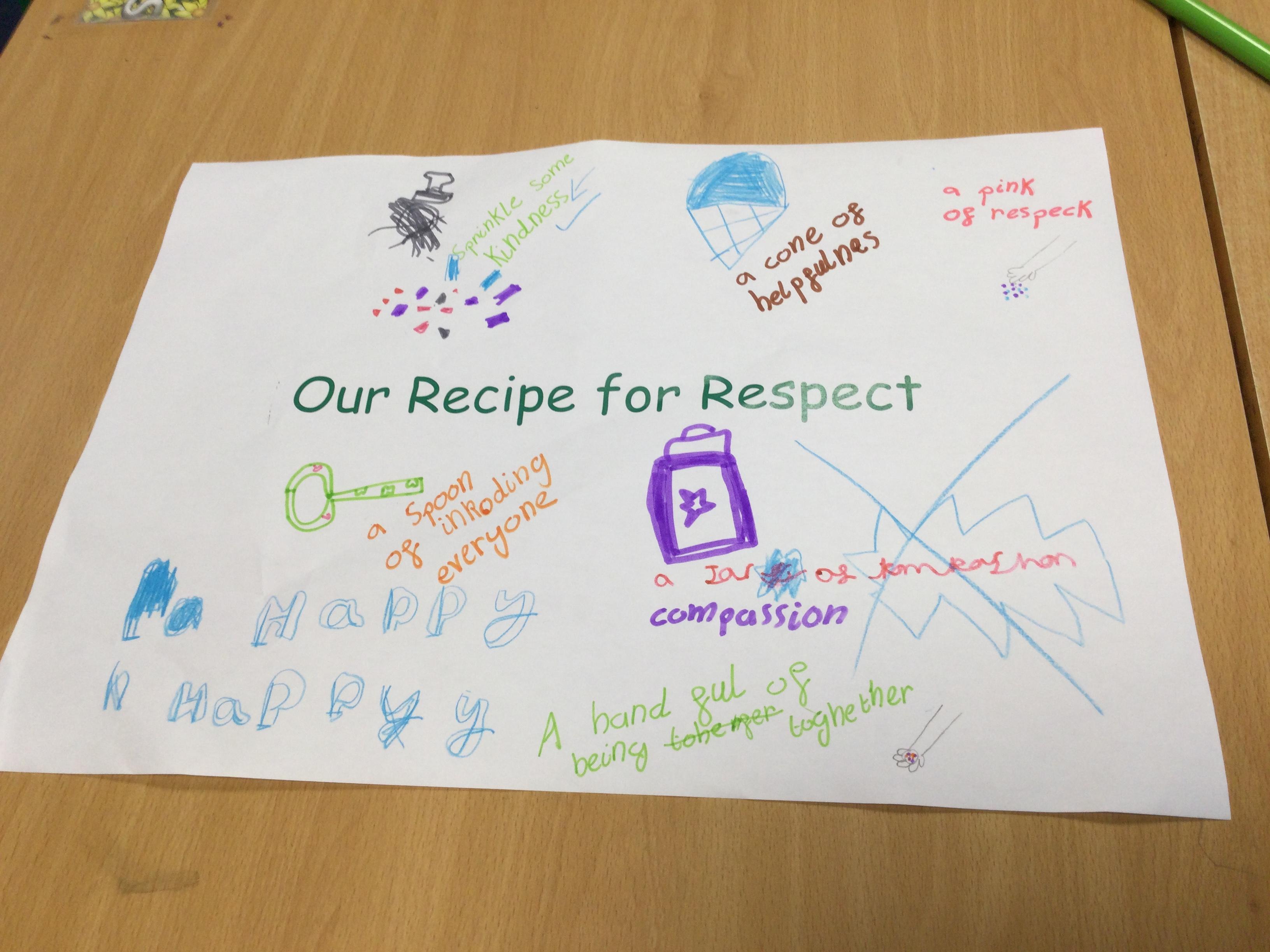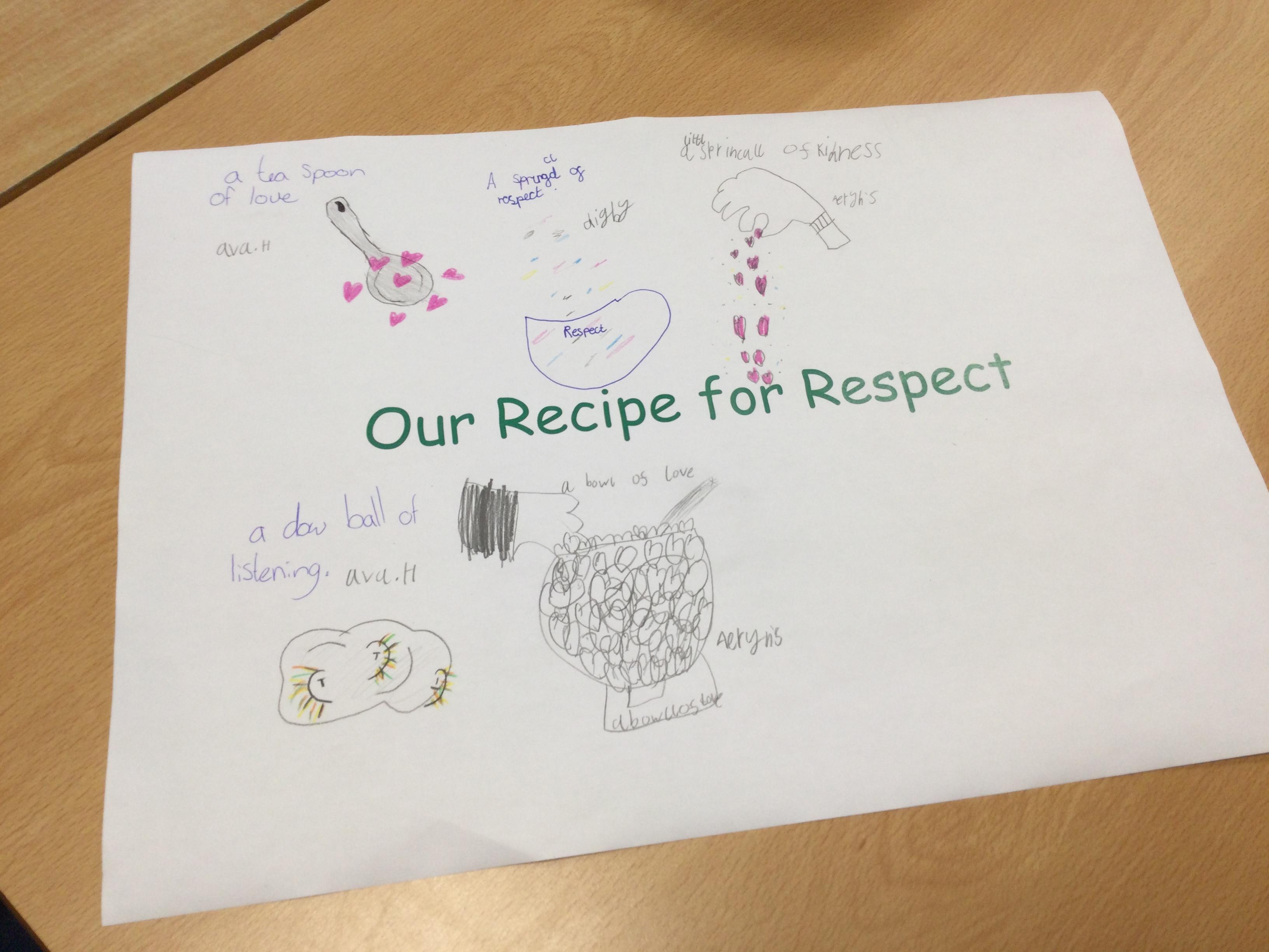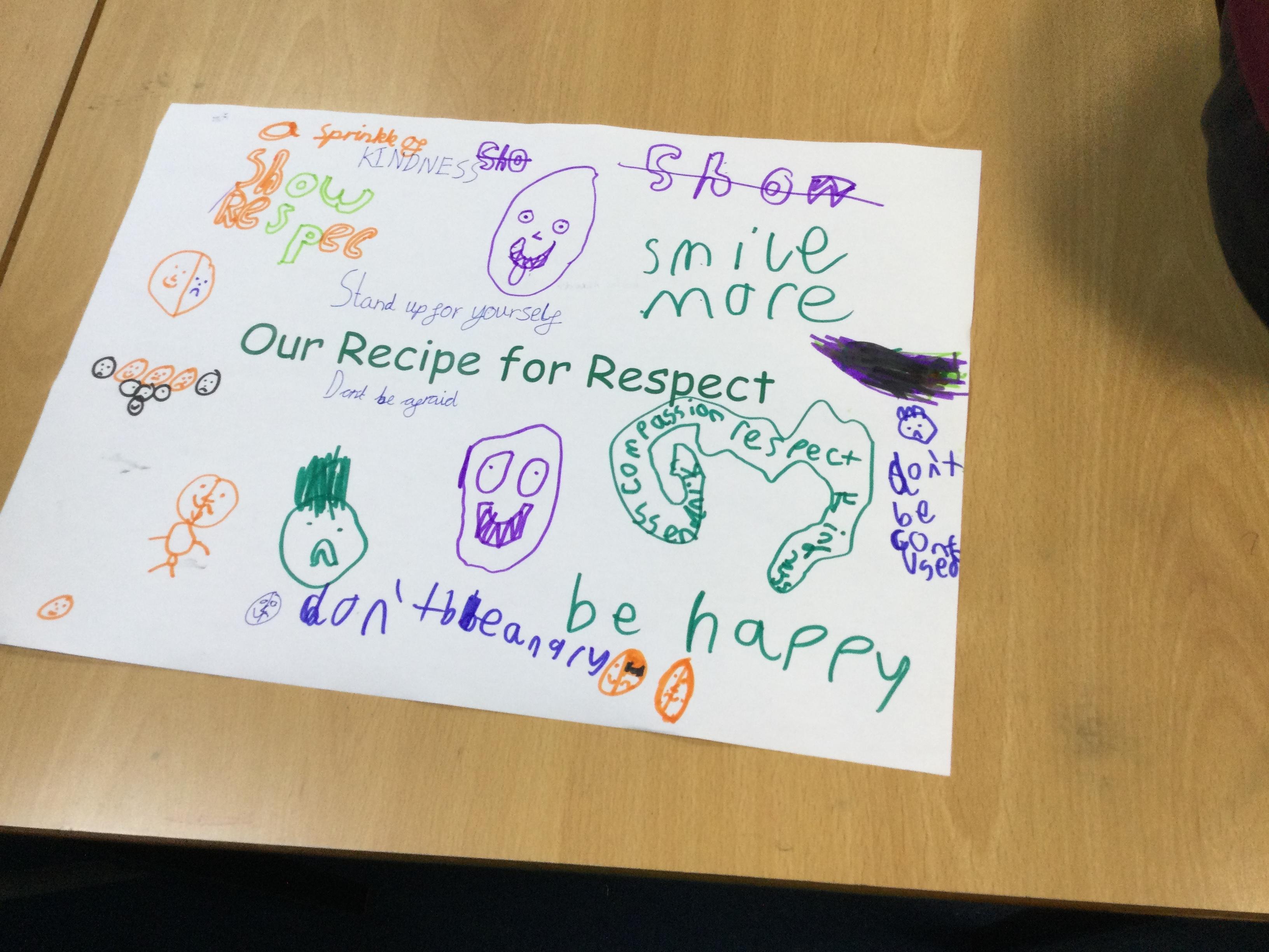 The children thought hard about respect and what this looks like. We played a scenario game which the children enjoyed and then the children worked in small groups to make their ‘recipe for respect’ poster.
