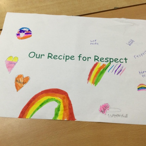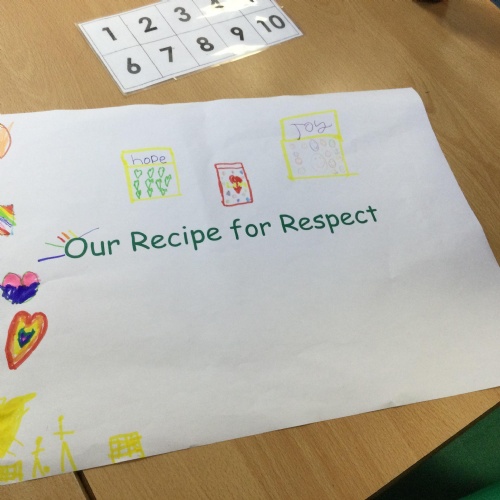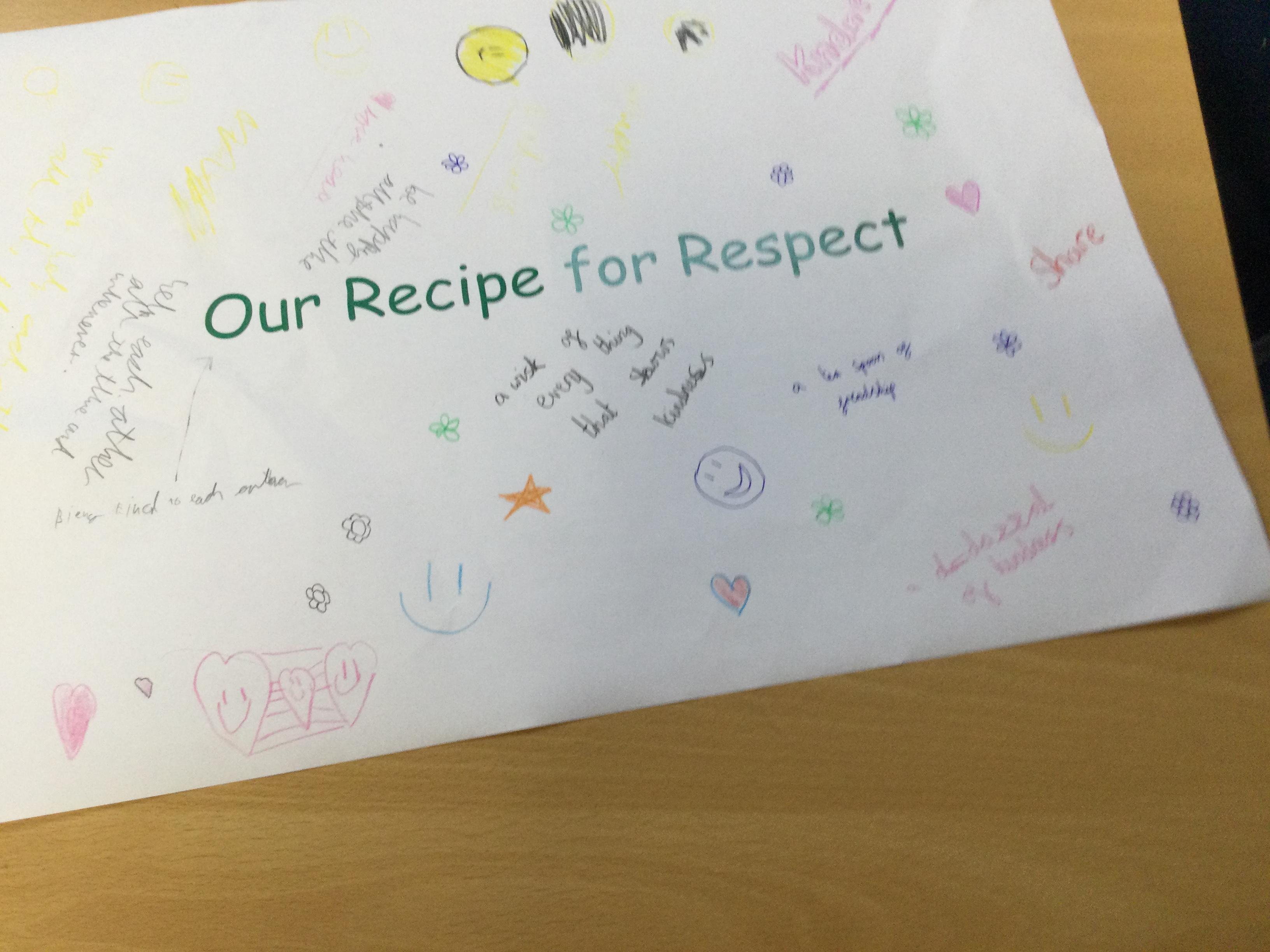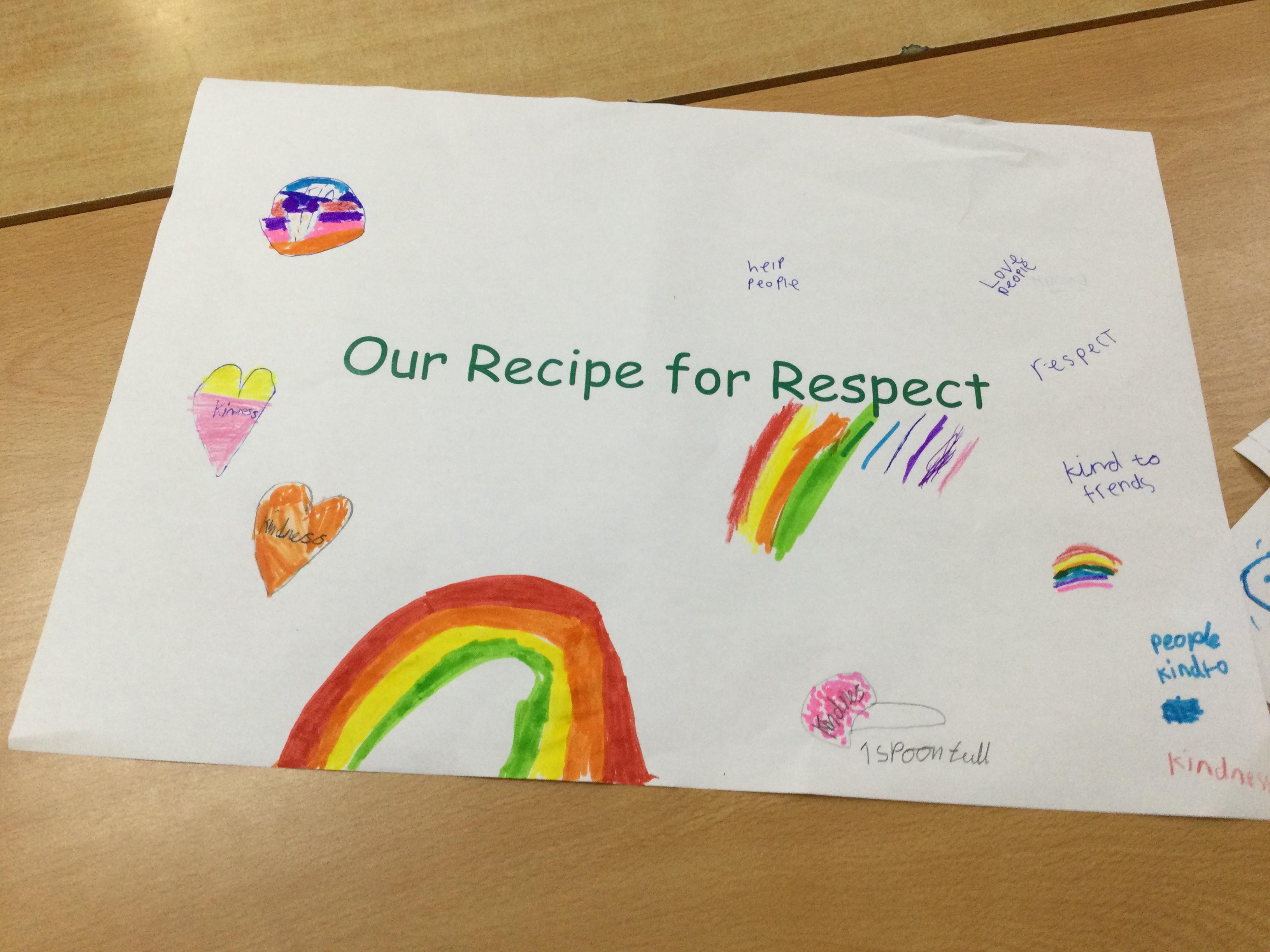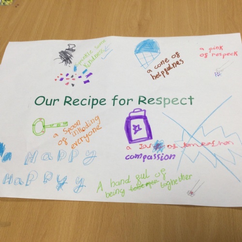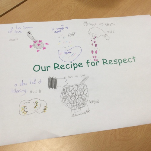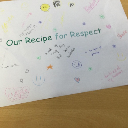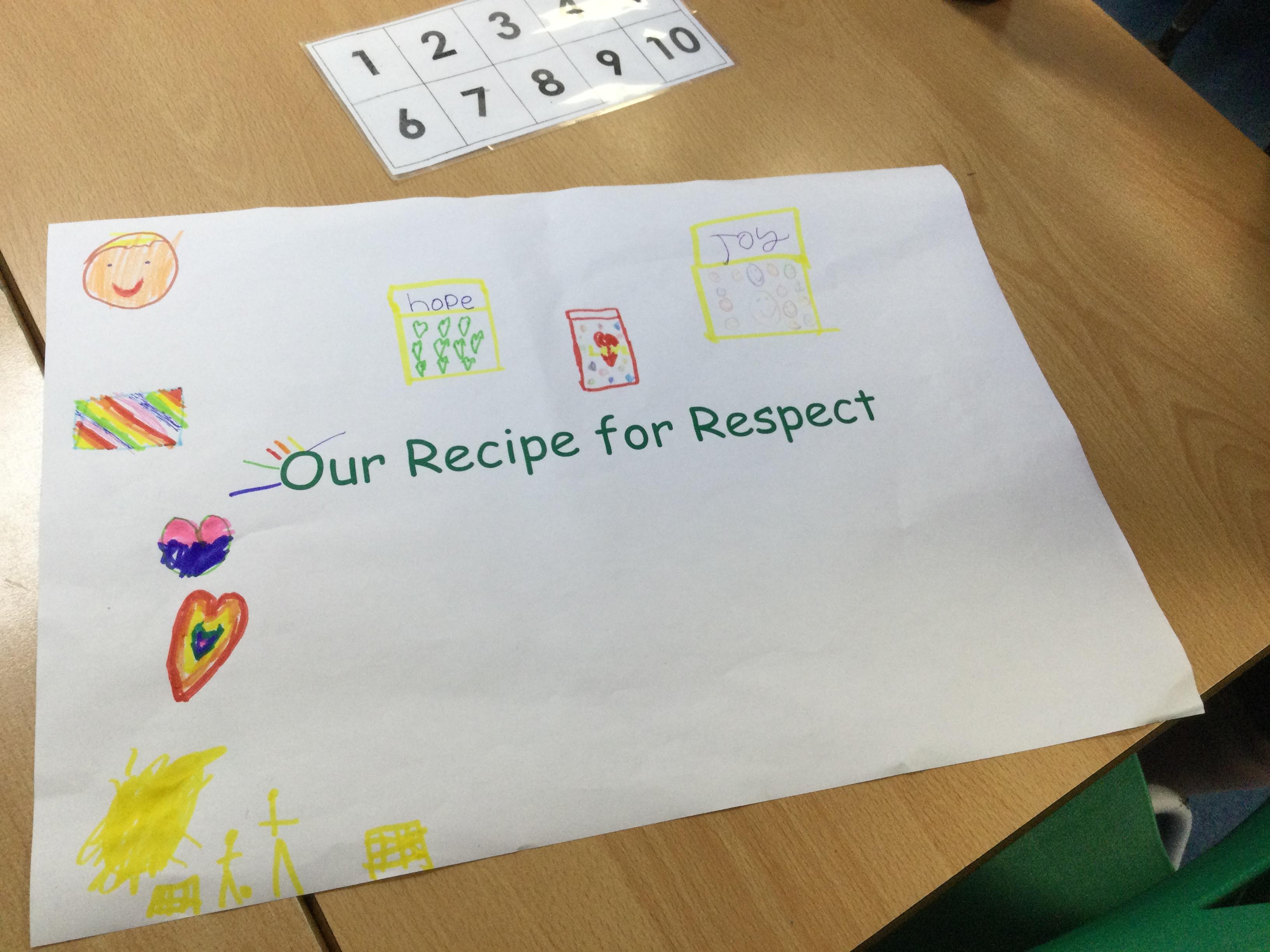 The children thought hard about respect and what this looks like. We played a scenario game which the children enjoyed and then the children worked in small groups to make their ‘recipe for respect’ poster.