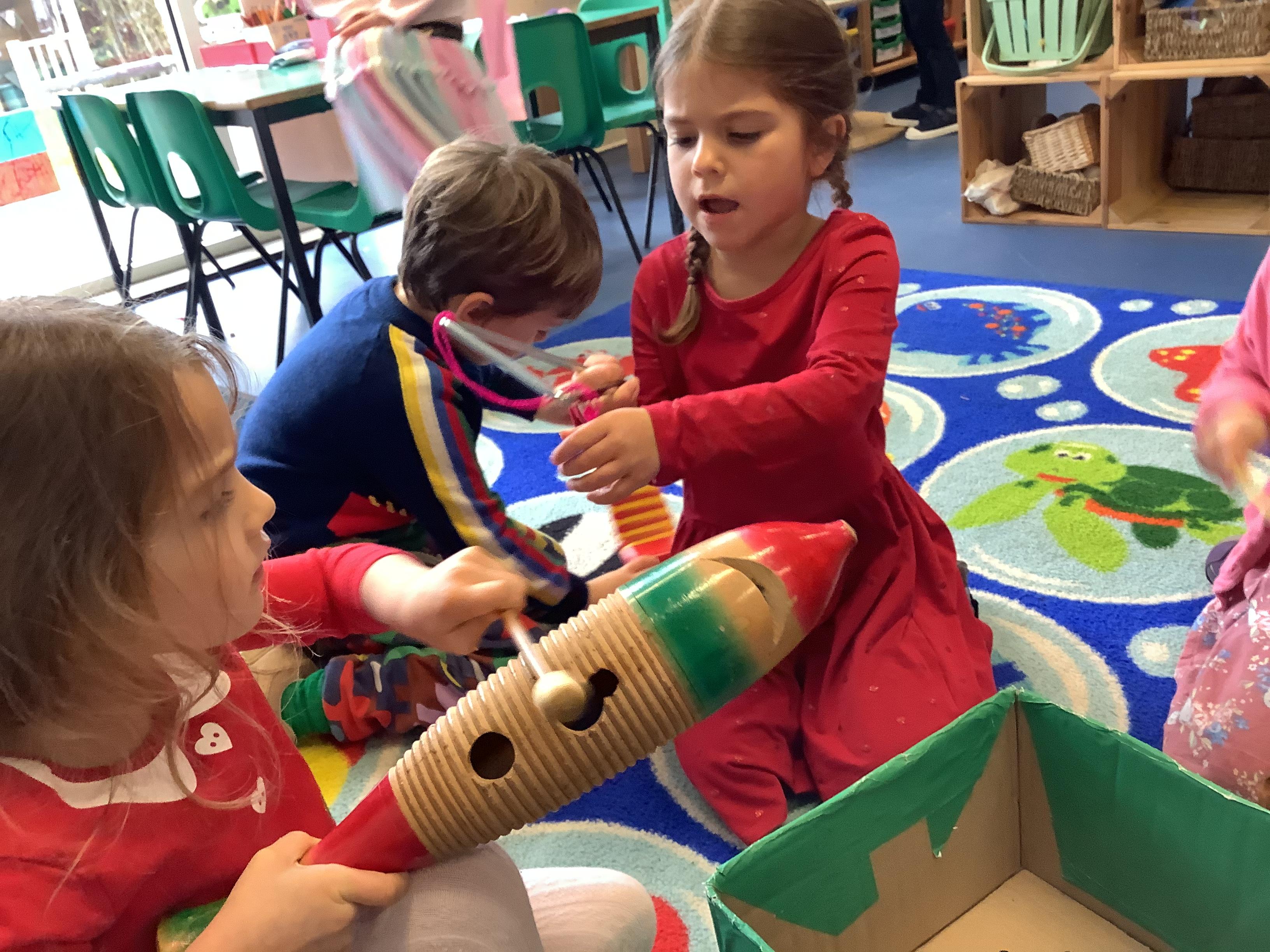 Peace at Last - Maize Class deciding which instruments sound like the sounds in the story? The triangle sounds like the leaky kitchen tap and the wooden Agogo sounds like the clock!