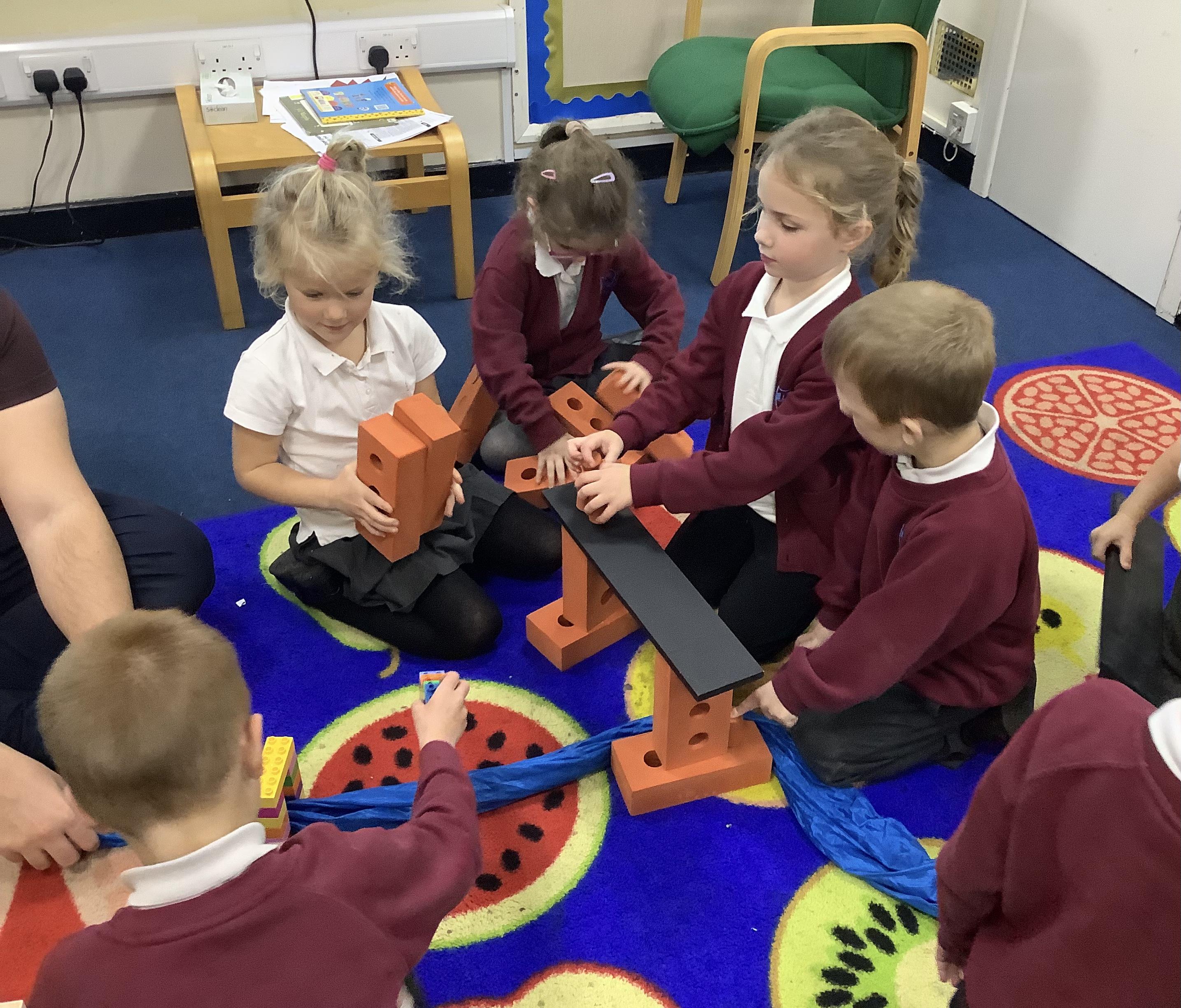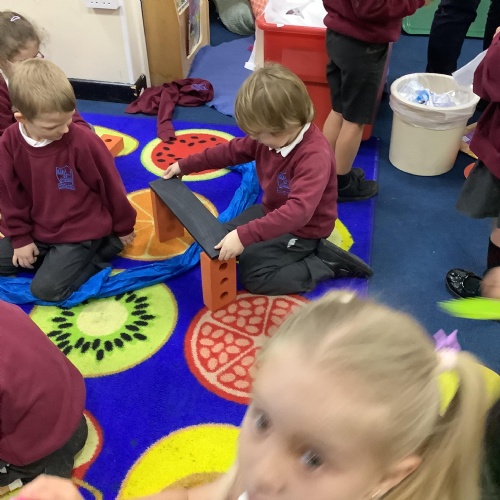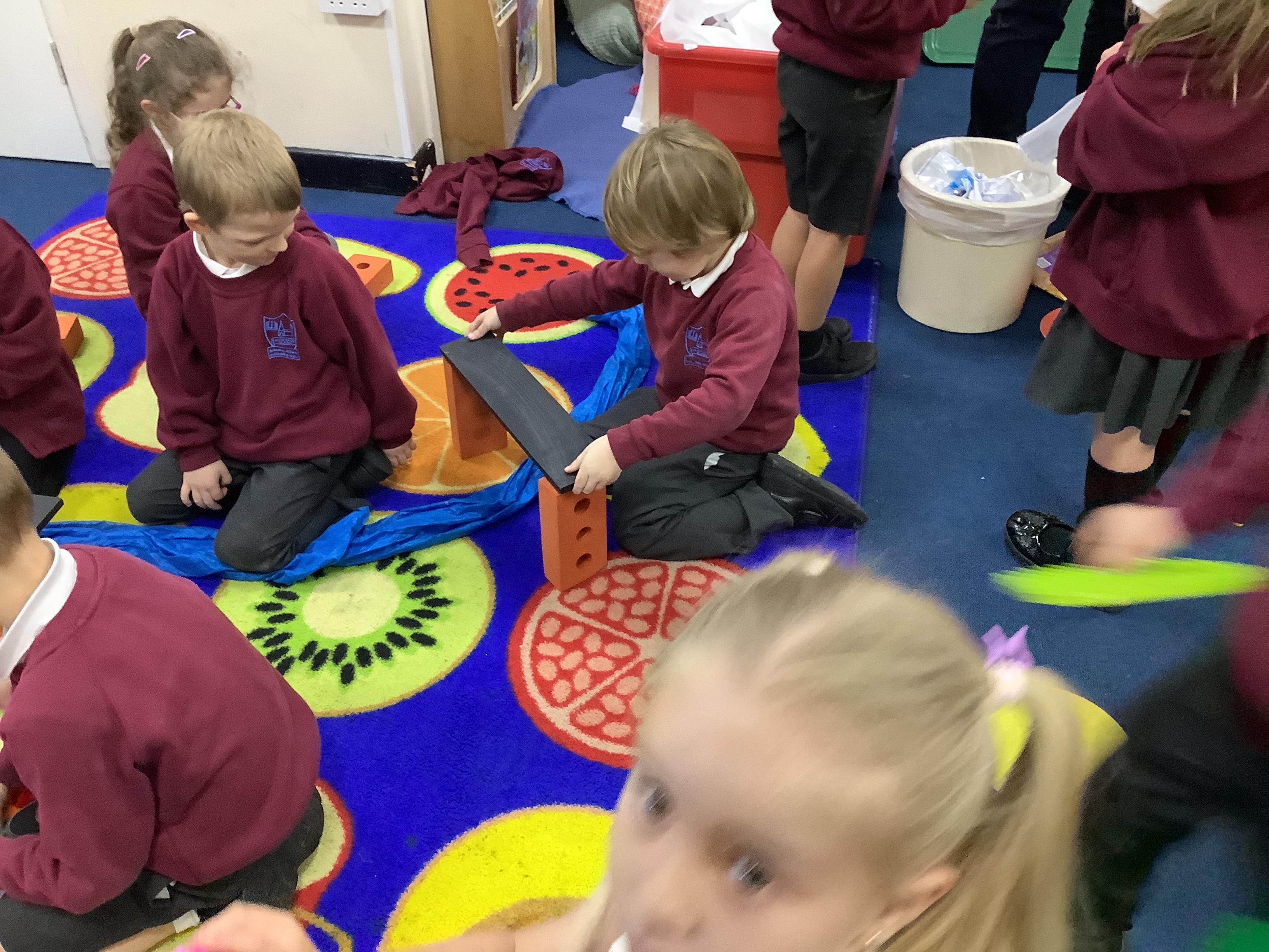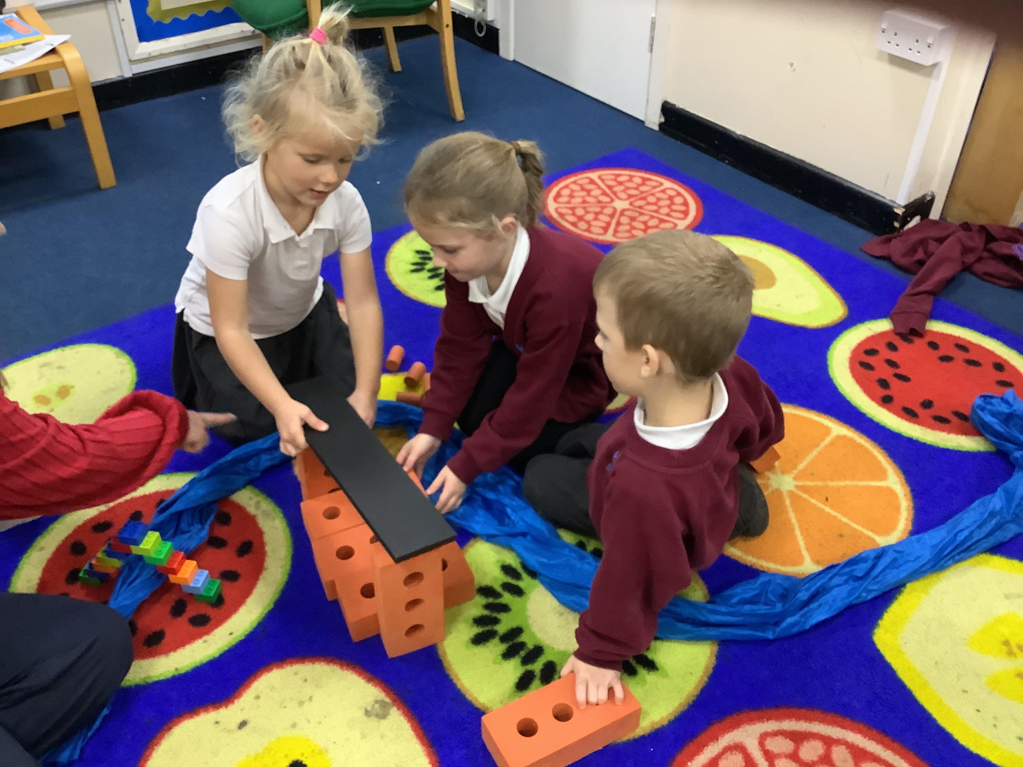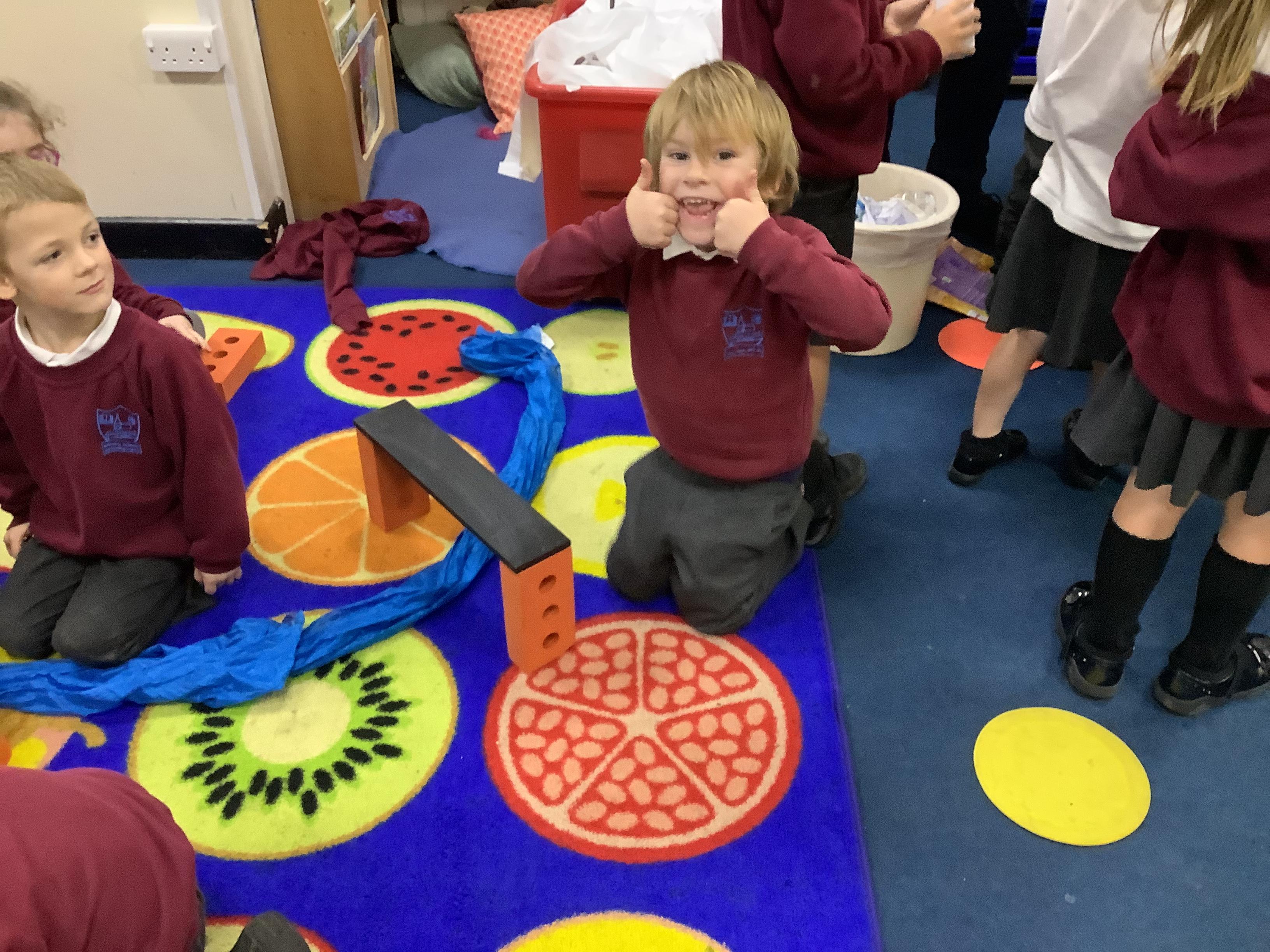 As a whole class we worked in groups to create a larger bridge to cross the treacherous carpet river!